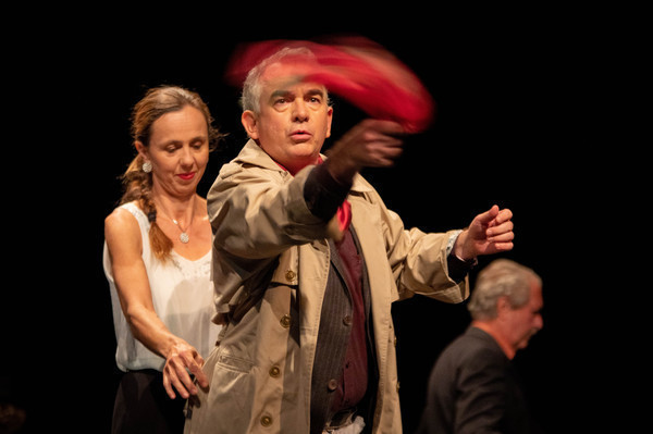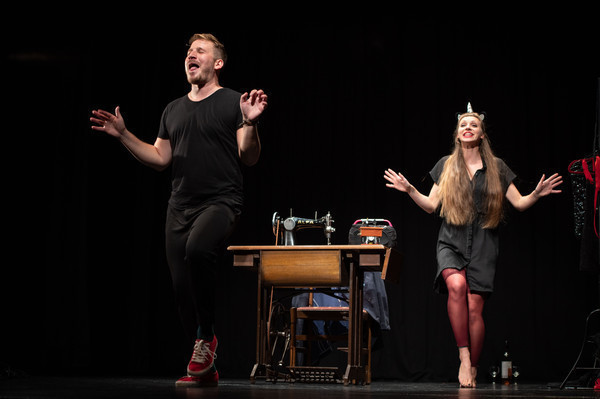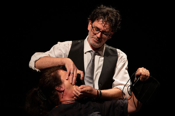 Trampuš za vlogo dr. Landernaua in Matej Čujovič za vlogo Pacarela v predstavi Strasti, laži in maček v žaklju gledališke skupine Loški oder Škofja Loka.